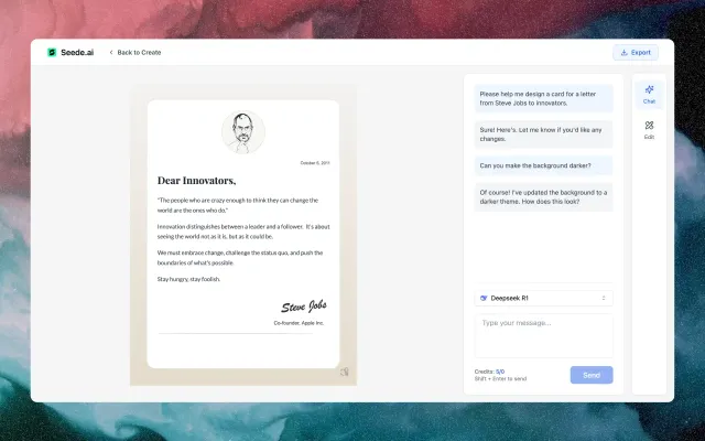 Seede.ai caters to both design professionals and beginners, offering intuitive customization options. Its AI-copilot functionality accelerates the design process, making the creation of professional-grade visuals accessible to everyone, regardless of their prior experience. It significantly reduces the time and effort required to produce engaging and impactful visual content. In essence, Seede.ai democratizes design, making it faster, easier, and more accessible for a wider audience.