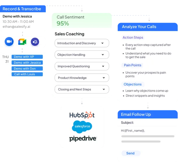 Salesify helps you increase win rates, save time, and improve productivity. It automatically captures critical meeting details and generates AI-driven follow-up emails. Identify areas for improvement, such as objection handling and negotiation skills, to refine your sales strategy.